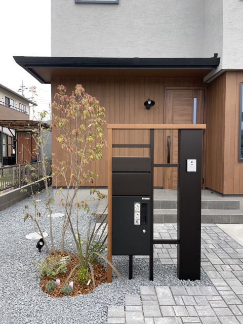 機能門柱はYKK ルシアスシリーズ、宅配ボックスもついています。